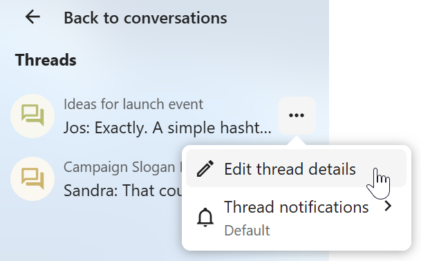 Moderators can configure the conversation. Select Conversation settings from the ... menu of the conversation on the top to access the settings.