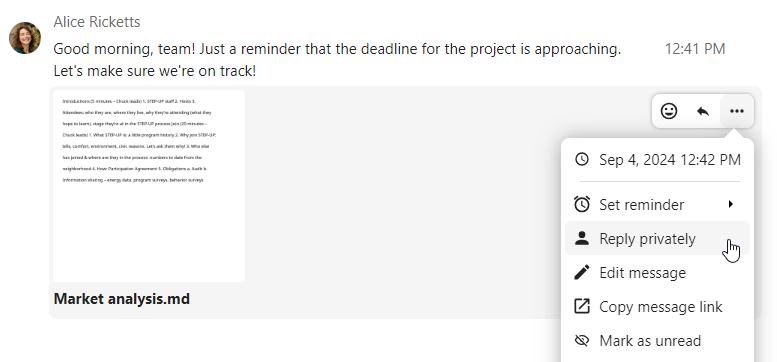 In the ... menu you can also choose to reply privately. This will open a one-to-one chat.