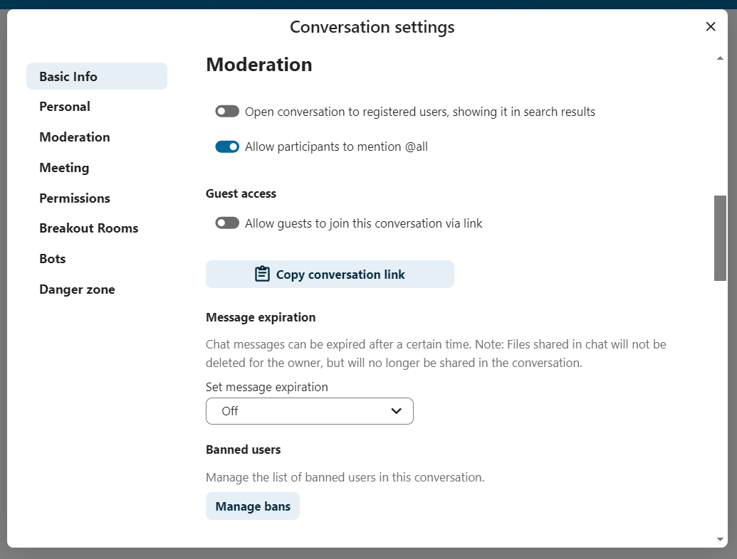 A group conversation can be shared with a public link, so guests can join a chat and a call. It can also be opened to registered users (or users from ‘Guests’ app), so they can discover and join this conversation.