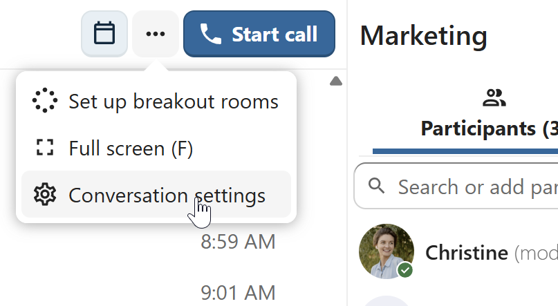 Moderators can configure the conversation. Select Conversation settings from the ... menu of the conversation on the top to access the settings.